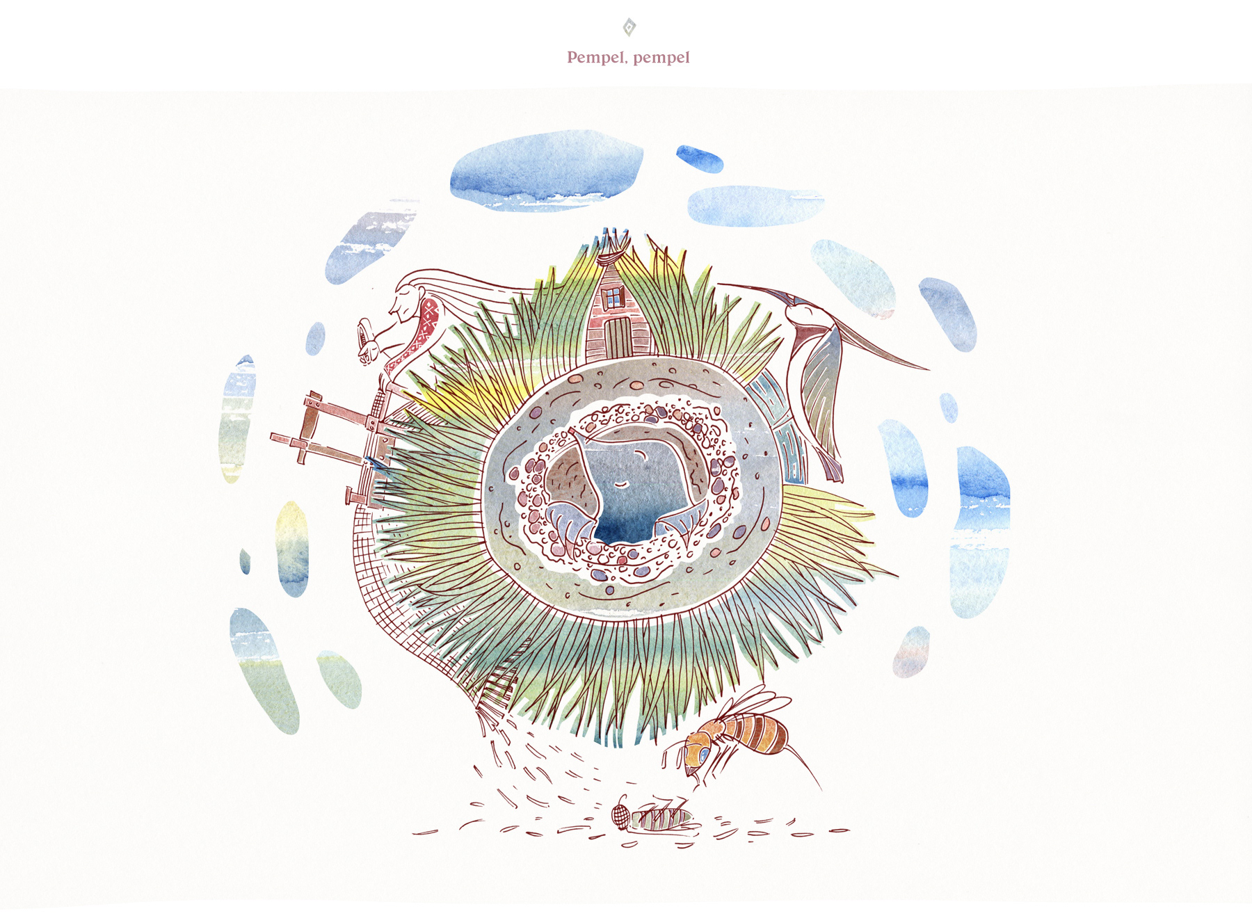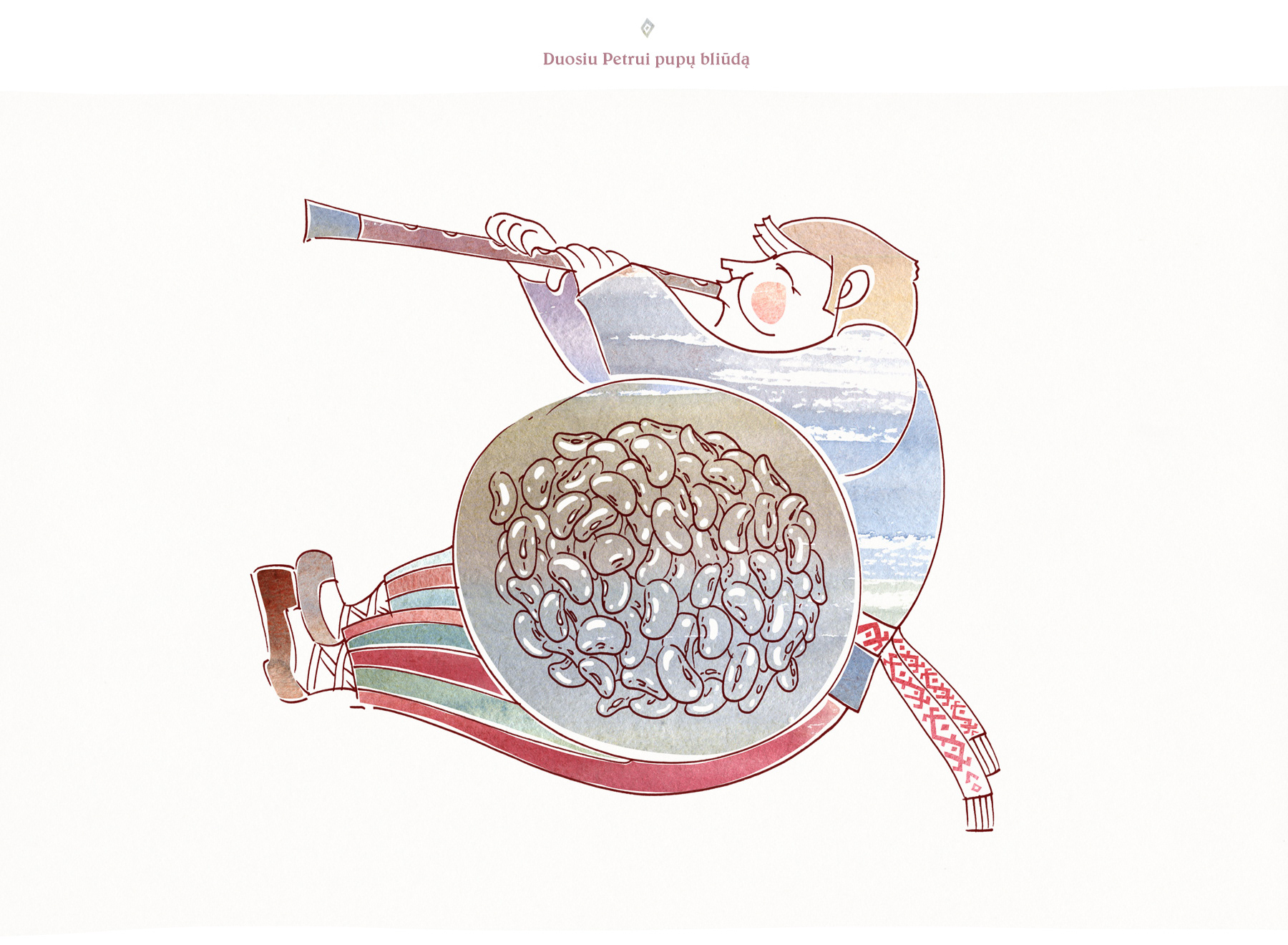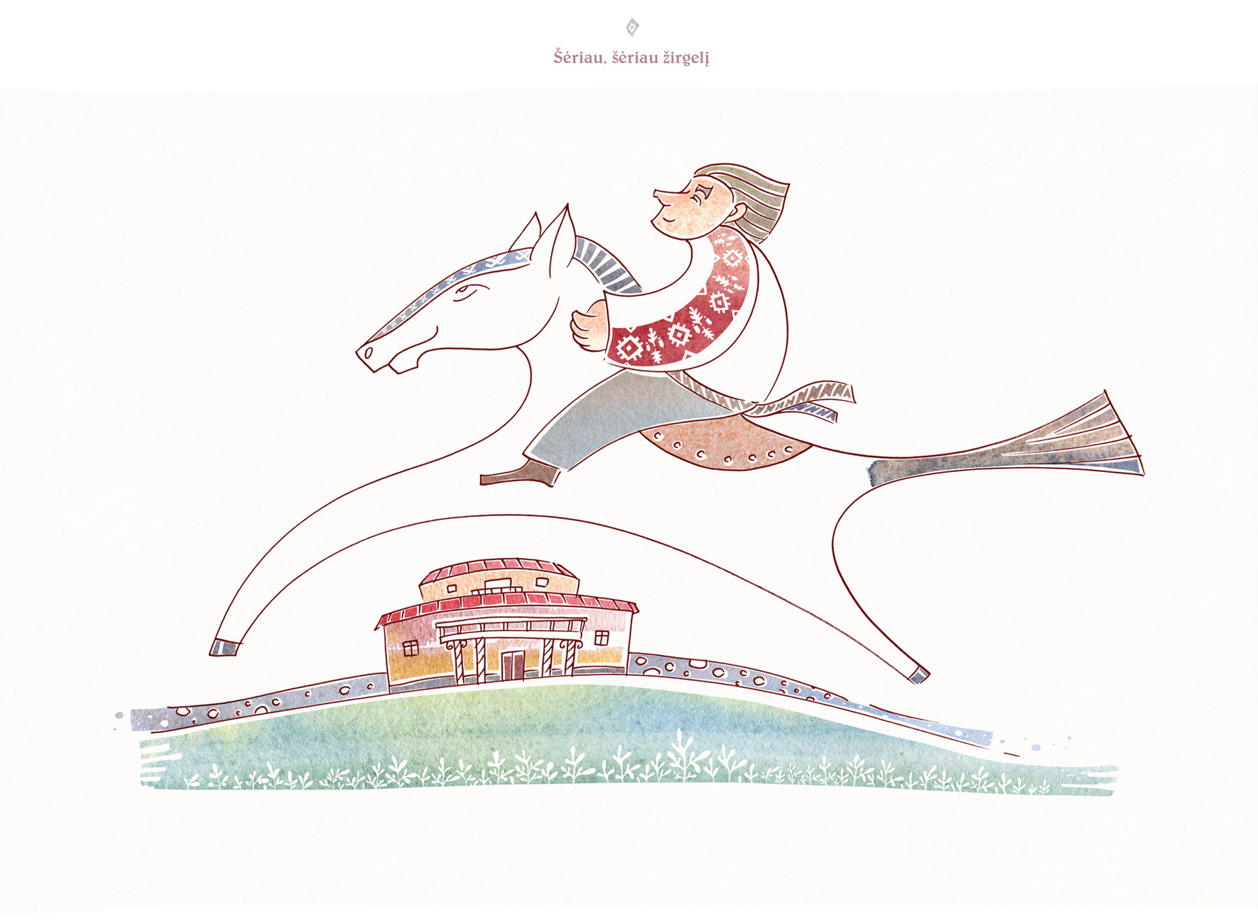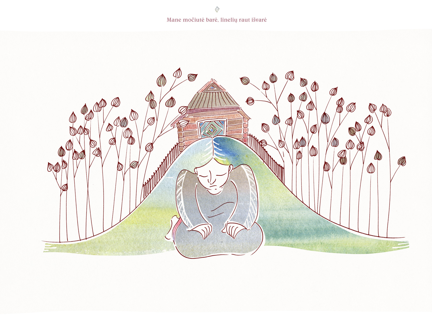 This set of illustrations was created for the children music book “SONG OF VIOLIN” („SMUIKELĖS GIESMĖ“), dedicated to the Lithuanian folk songs. Lightness, pure line, watercolor and subtle compositions were a visual interpretation of the sense of music. The concept of the graphic style was to reveal a song in a light drawing and create a musical illustration. The essential inspiration to complete this idea was Lithuanian folk art.