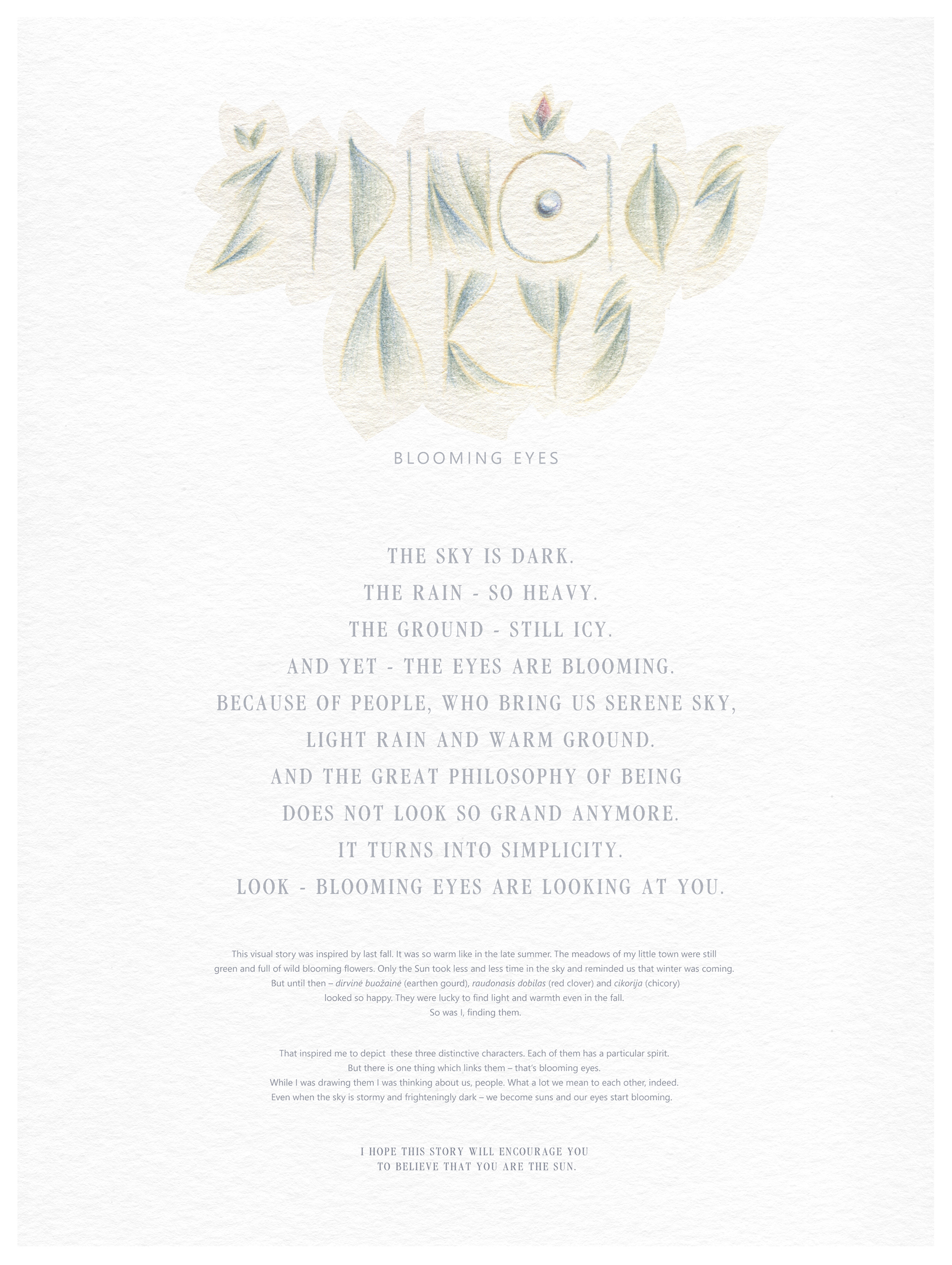 This visual story was inspired by last fall. It was so warm like a late summer. The Meadows of my little town were still green and full of wild flowers. Only the Sun took less and less time in the sky and reminded us that winter was coming. But until then dirvinė buožainė (earthen gourd), raudonasis dobilas (red clover) and cikorija (chicory) looked so happy. They were lucky to find light and warmth even in the fall. So was I, finding them. That inspired me to depict these three distinctive characters. Each of them has a particular spirit. But there is one thing which links them – that‘s blooming eyes. While I was drawing them I was thinking about us, people. What a lot we mean to each other, indeed. Even when the sky is stormy and frighteningly dark – we become suns and our eyes start blooming. I hope this story will encourage you to believe that you are the Sun.